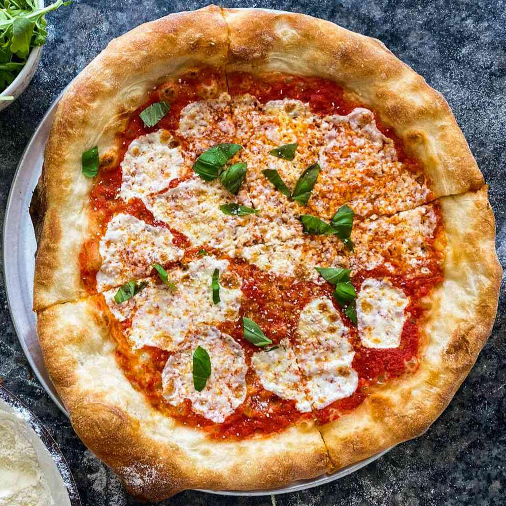A simple-but-satisfying dish of thinly worked dough topped with tomatoes and cheese, baked in a wood-fired oven until crispy.