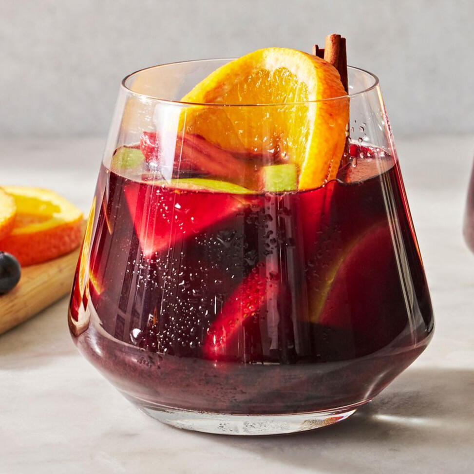A chilled glass of dry red wine, filled to the brim of a variety of tart tasting fruits!