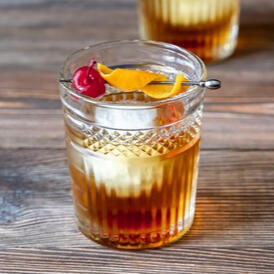 An iced glass of bourbon (Or rye whiskey), muddled with sweet sugar and bitters, garnished with a cocktail cherry and orange zest.